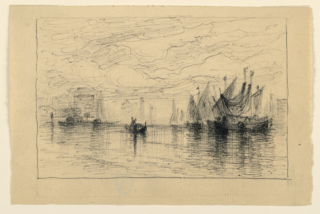 Drawing, Ships in the Venetian Lagoon; Samuel Colman (American, 1832 - 1920); USA; pen and black ink, graphite on paper; 15.8 × 24.3 cm (6 1/4 × 9 9/16 in.); Gift of Mrs. Samuel Colman; 1939-85-52-b
