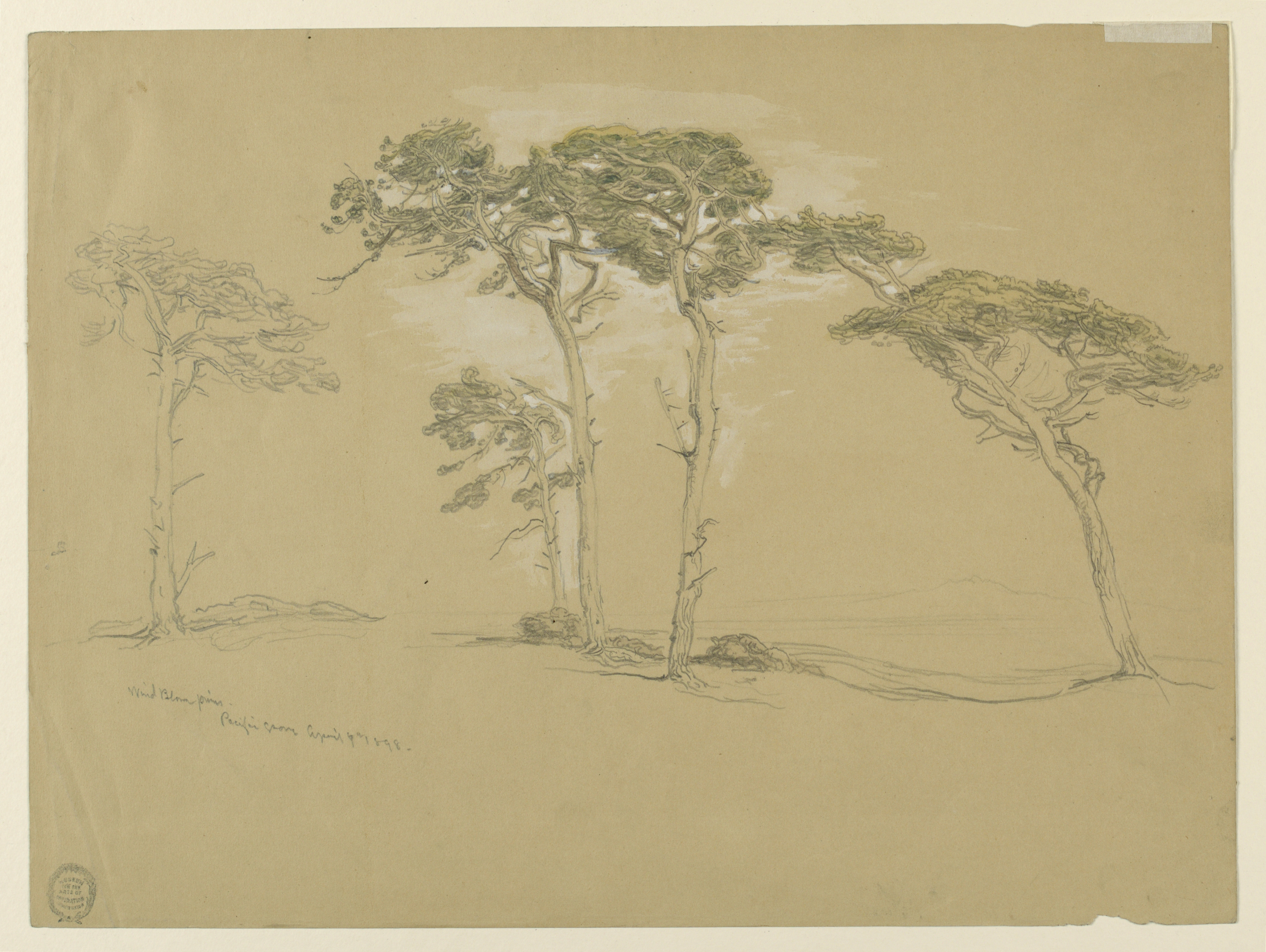 Drawing, Windblown Pines, Pacific Grove. Verso: Pacific Coast road to Point Sur.; Samuel Colman (American, 1832 - 1920); USA; obverse: graphite and green wash, white guache, on buff paper. reverse: pencil, pen, and black ink.; Frame: 39.7 x 50.2 cm (15 5/8 x 19 3/4 in.); Gift of Mrs. Samuel Colman; 1939-85-9