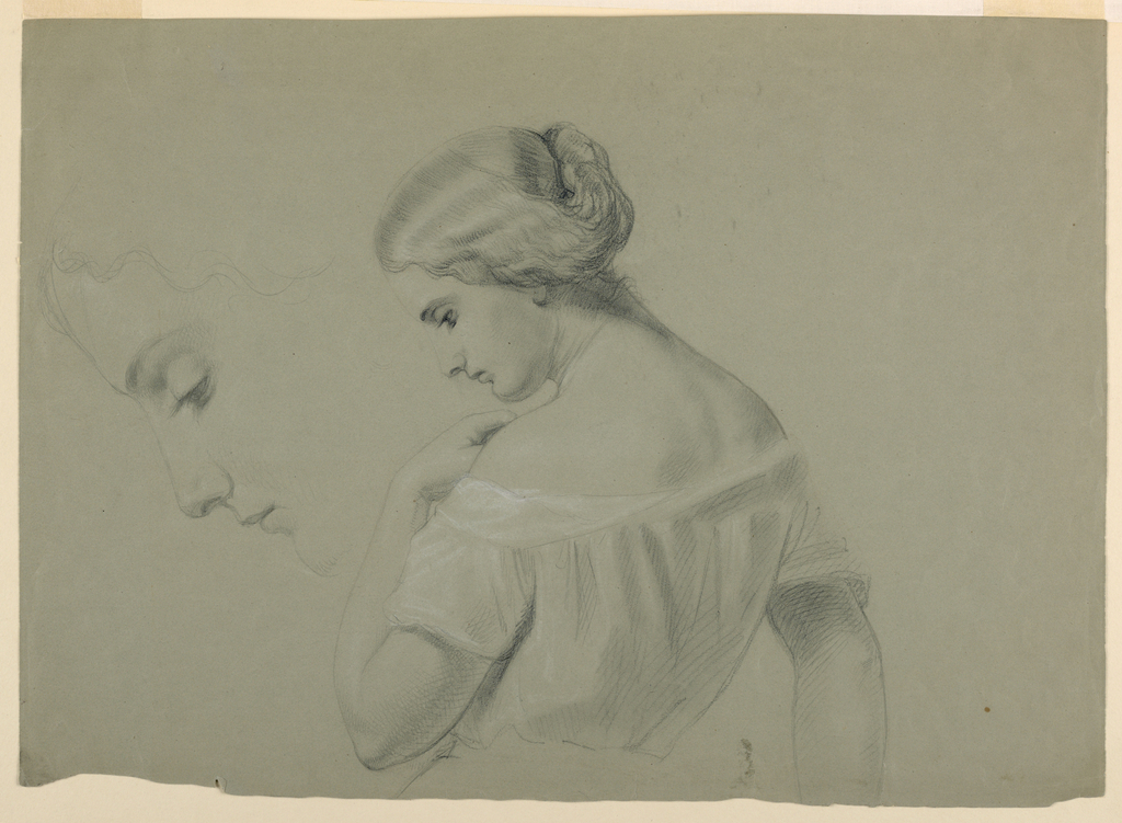 Drawing, Study of a Woman in Profile; Daniel Huntington (American, 1816–1906); USA; graphite, white chalk on grey wove paper; 34.5 x 47.5 cm (13 9/16 x 18 11/16 in.) ; Bequest of Erskine Hewitt; 1942-50-97