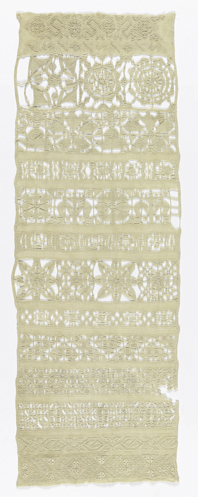 This is a Sampler. It is dated 17th century and we acquired it in 1946. Its medium is linen and its technique is embroidered with satin, double running, buttonhole stitches over an arched cord and couching. It is a part of the Textiles department.
