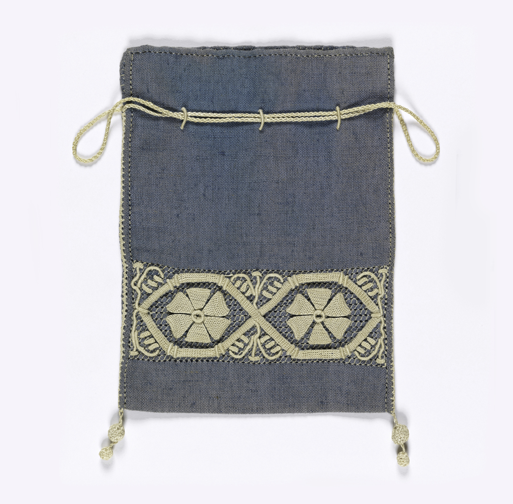 This is a Hand bag. It is dated 1900–1946 and we acquired it in 1946. Its medium is linen, mercerized cotton and its technique is embroidered on plain weave. It is a part of the Textiles department.