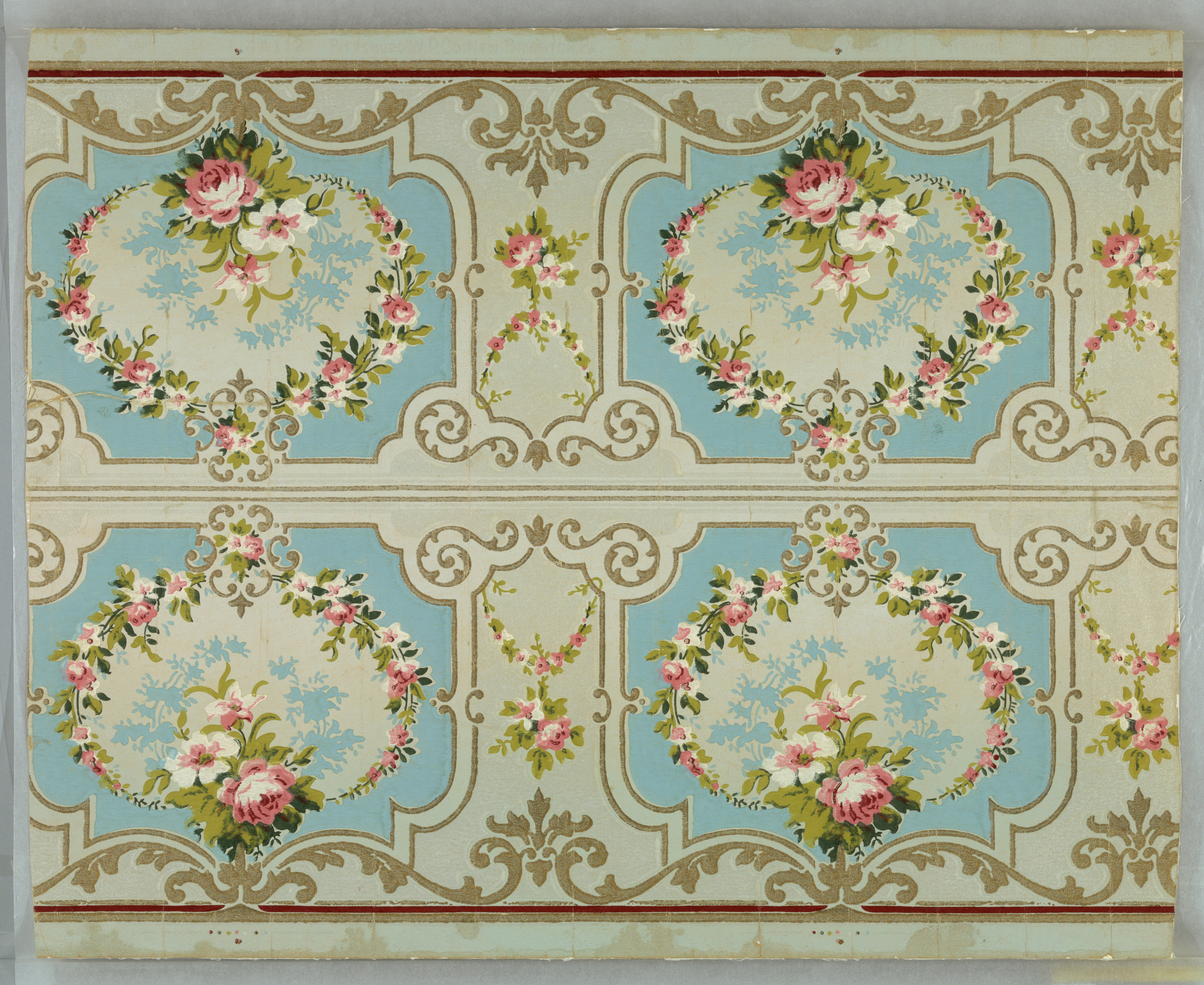 This is a Border. It was manufactured by Pittsburg W.P. Co.. It is dated 1890–95 and we acquired it in 1949. Its medium is machine-printed. It is a part of the Wallcoverings department.
