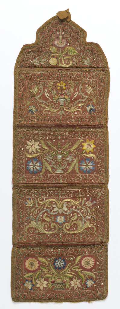 This is a Wall pocket. It is dated 17th century and we acquired it in 1950. Its medium is silk, metal and its technique is embroidery on rust-red silk satin. stem, satin and knot stitches using dyed silks; couched gold-wrapped silk and strips of silver foil; plus attached silver spangles. It is a part of the Textiles department.