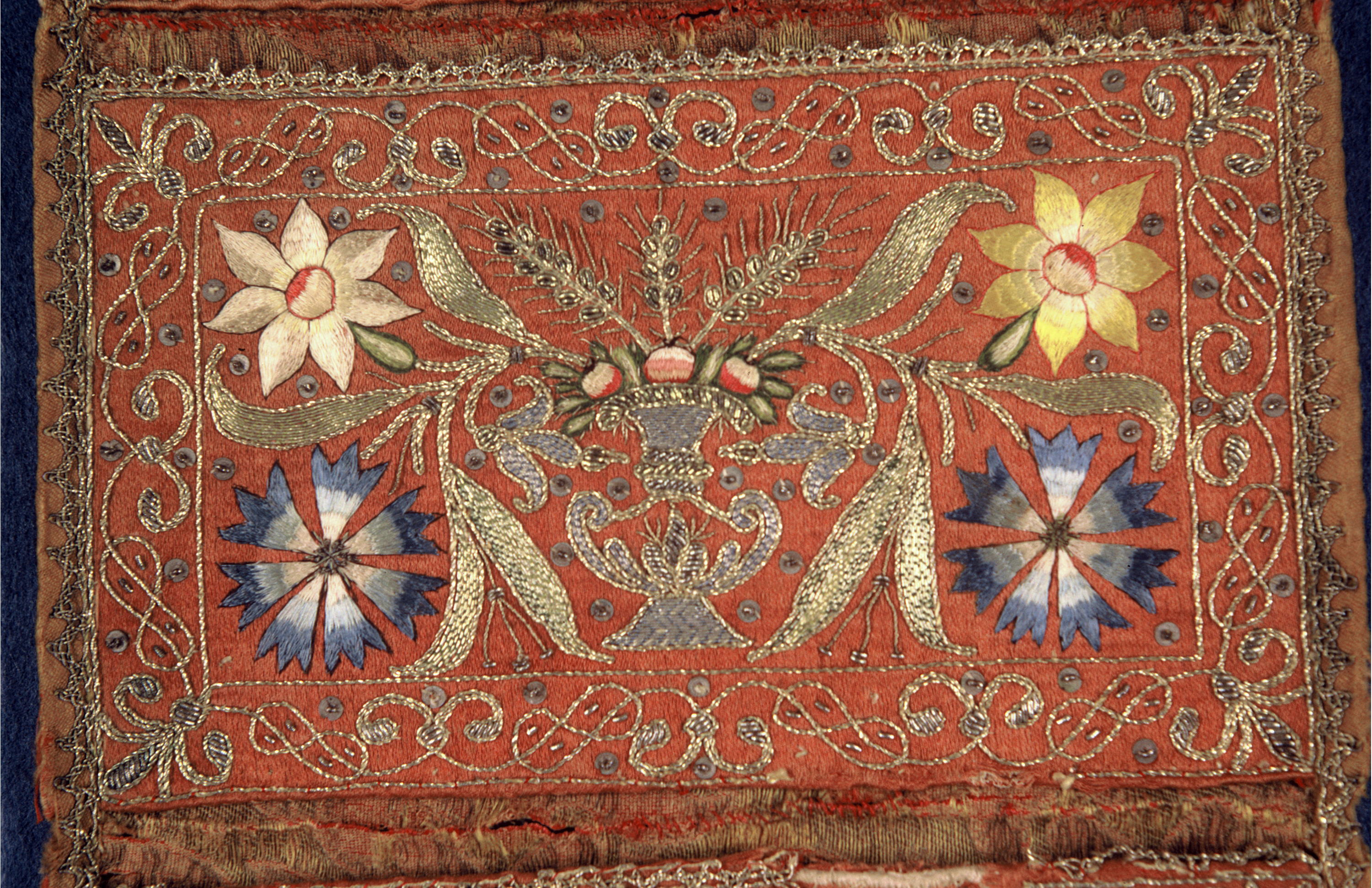 This is a Wall pocket. It is dated 17th century and we acquired it in 1950. Its medium is silk, metal and its technique is embroidery on rust-red silk satin. stem, satin and knot stitches using dyed silks; couched gold-wrapped silk and strips of silver foil; plus attached silver spangles. It is a part of the Textiles department.