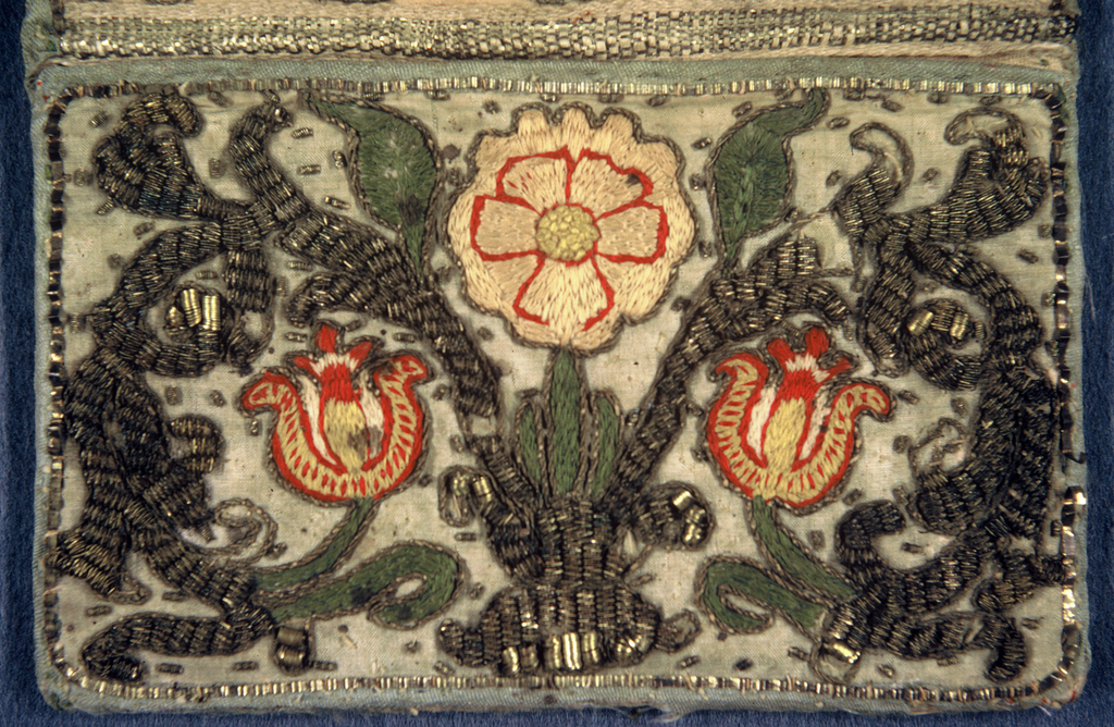 This is a Wall pocket. It is dated late 17th century and we acquired it in 1950. Its medium is silk, metallic thread and its technique is embroidery on salmon (faded) and blue silk plain weave; stem, knot, satin and chain stitches using dyed silks; couched gold-wrapped silk and strips of silver foil; plus attached coils of silver and gilt wire. It is a part of the Textiles department.