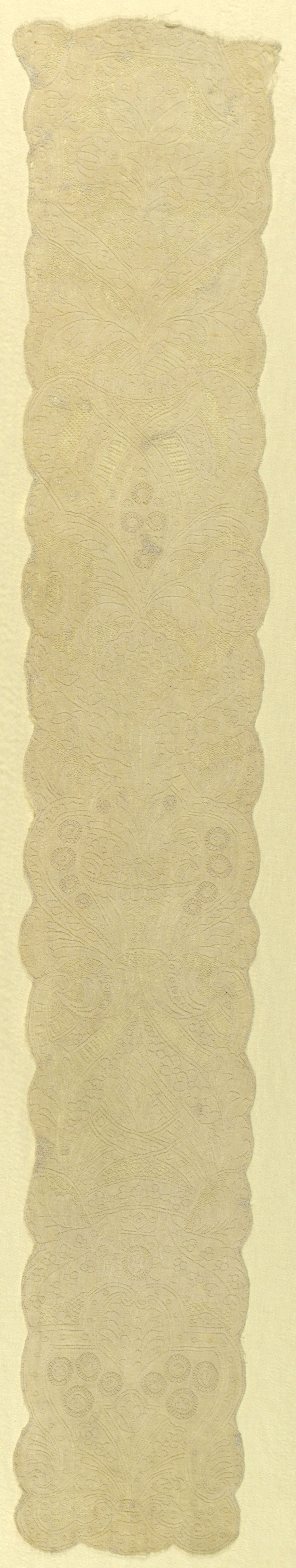 This is a Cap streamers. It is dated 1700–1750 and we acquired it in 1950. Its medium is linen and its technique is bobbin lace, binche ground. It is a part of the Textiles department.