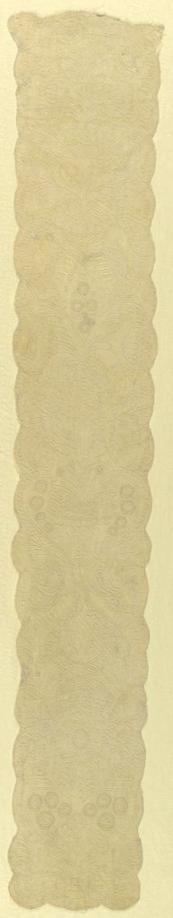 The yarn of these streamers is very fine, the structure remarkably even, and what can be called a background is filled with a small scale pattern. While the design of each piece is vertically symmetrical it is not literally so.