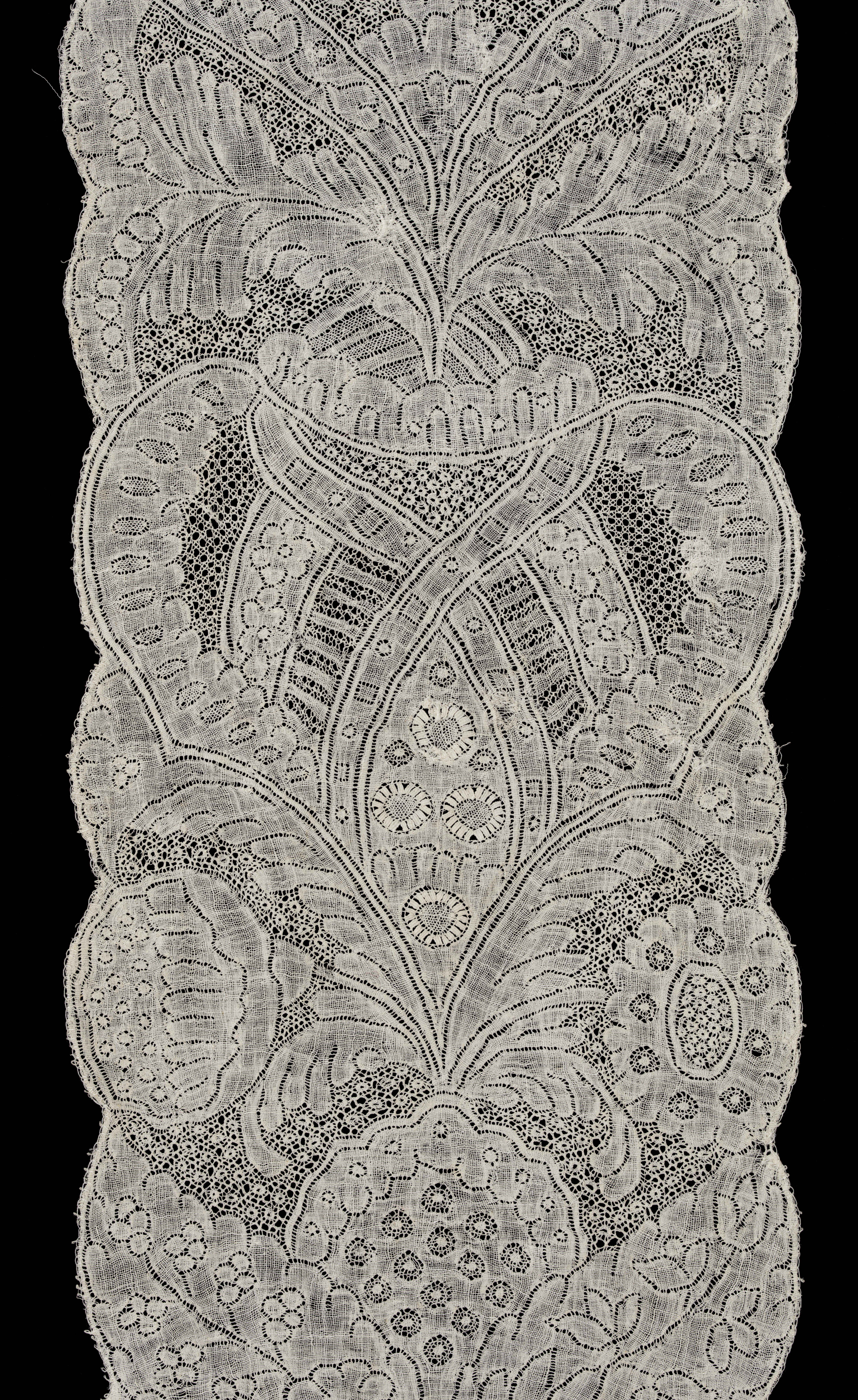 This is a Cap streamers. It is dated 1700–1750 and we acquired it in 1950. Its medium is linen and its technique is bobbin lace, binche ground. It is a part of the Textiles department.