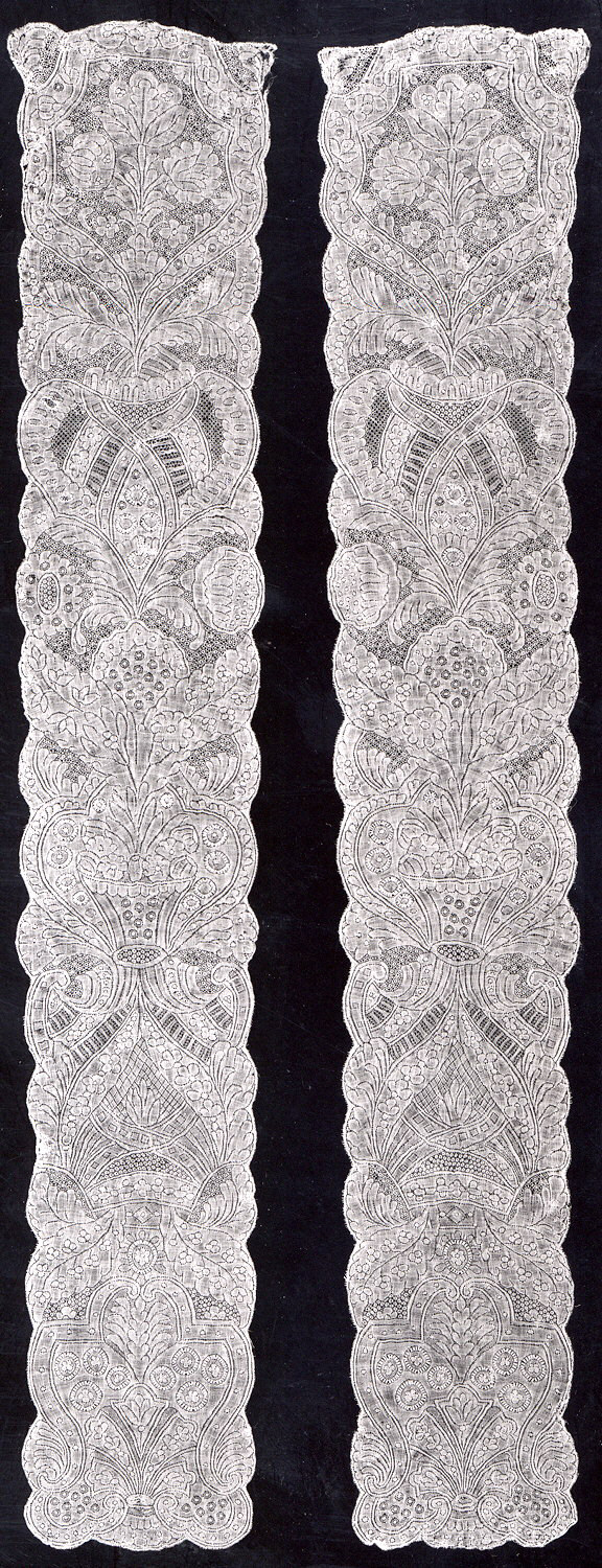 This is a Cap streamers. It is dated 1700–1750 and we acquired it in 1950. Its medium is linen and its technique is bobbin lace, binche ground. It is a part of the Textiles department.