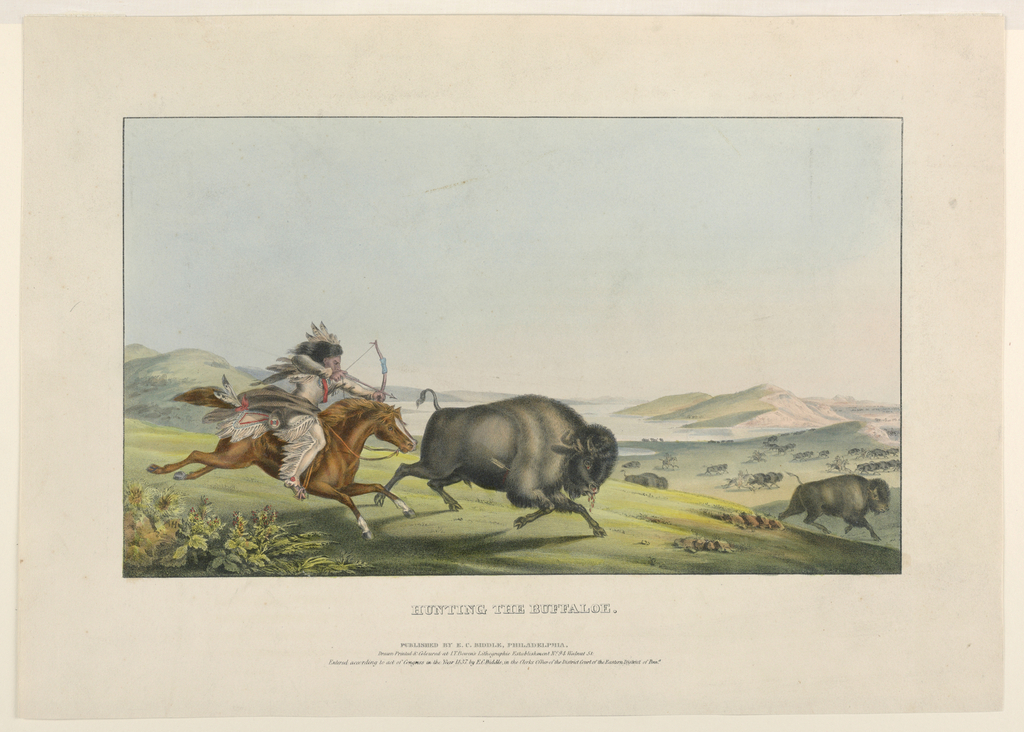 Print, Hunting the Buffalo; J.T. Bowen (American, 1801 - 1856); lithograph; Gift of Mary Rutherford Jay; 1950-123-1