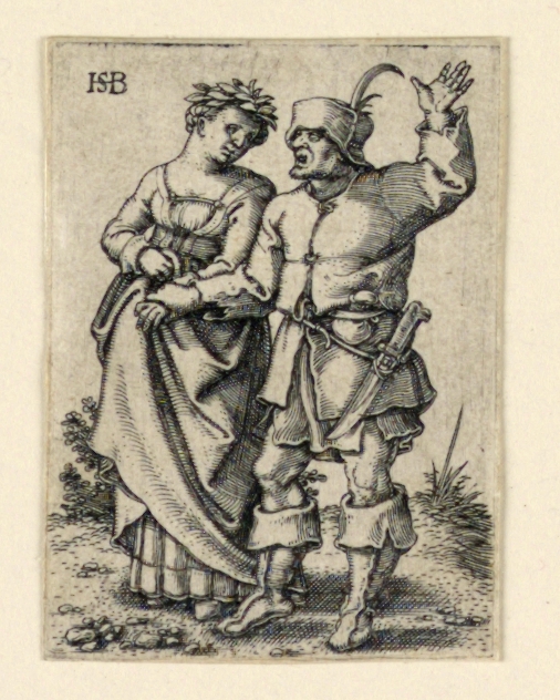 Print, The Wedding Procession: Couple walking left, woman wearing a wreath; Print Maker: Hans Sebald Beham (German, 1500–1550); engraving on laid paper; Gift of Leo Wallerstein; 1950-131-108