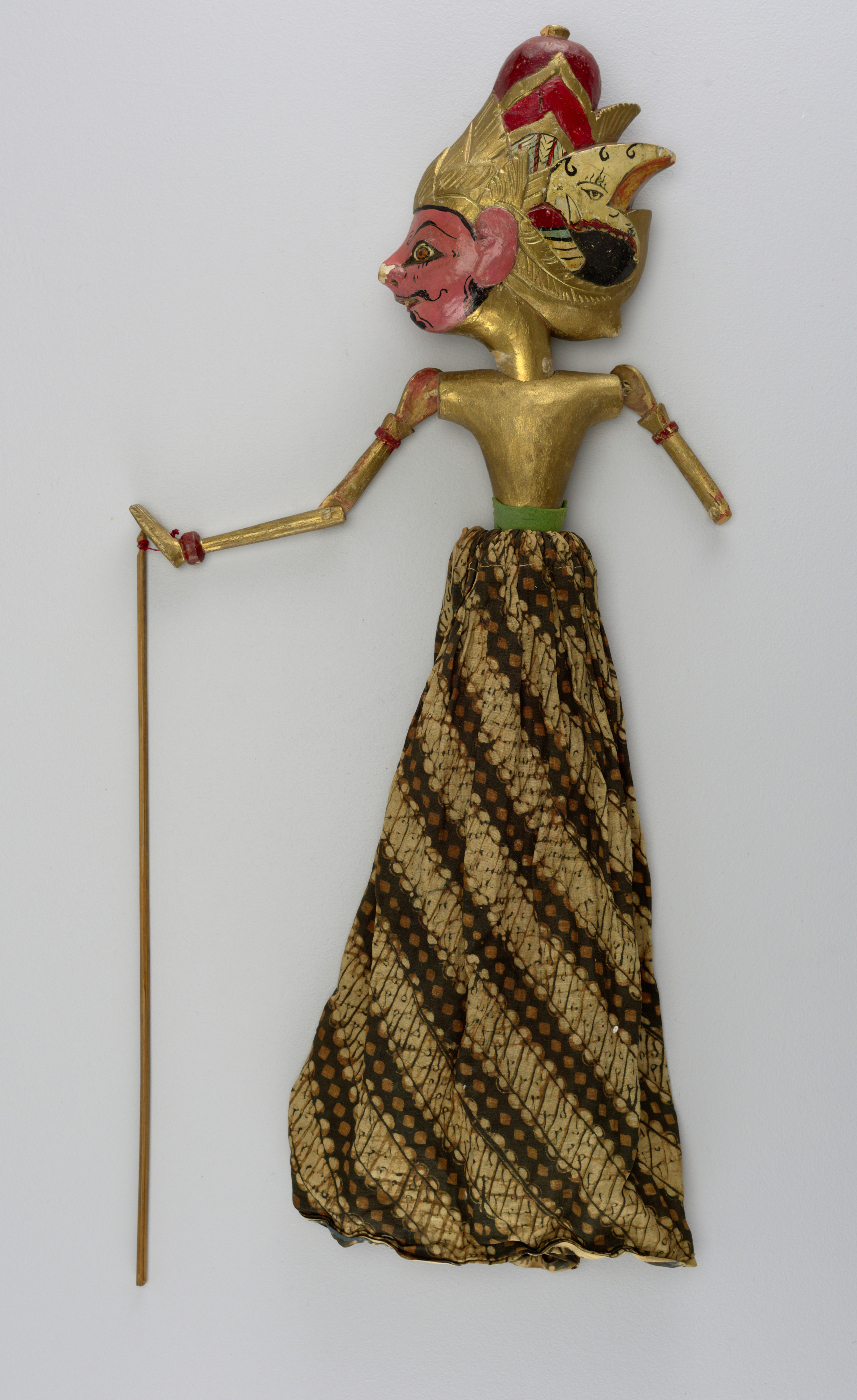 This is a Puppet. It is dated 19th century and we acquired it in 1950. Its medium is carved and painted wood, batik textile. It is a part of the Product Design and Decorative Arts department.