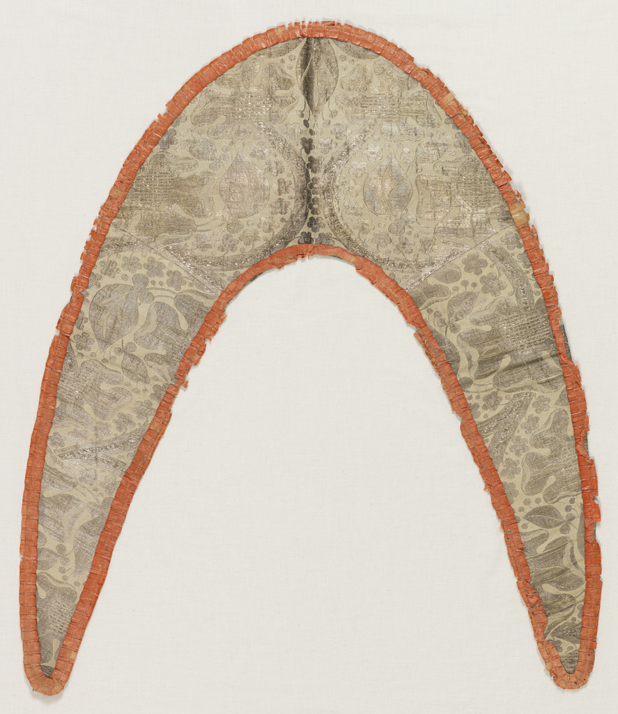 This is a Capelet. It is dated 18th century and we acquired it in 1950. Its medium is silk, wool, metallic thread and its technique is plain weave with supplementary weft; twill (lining). It is a part of the Textiles department.