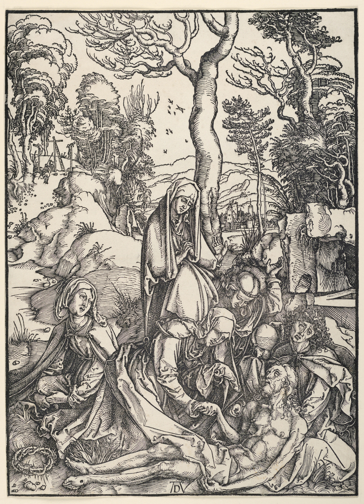 Print, The Lamentation; Albrecht Dürer (German, 1471–1528); Germany; woodcut on laid paper; 39.6 x 28.4 cm (15 9/16 x 11 3/16 in.); 1950-30-10