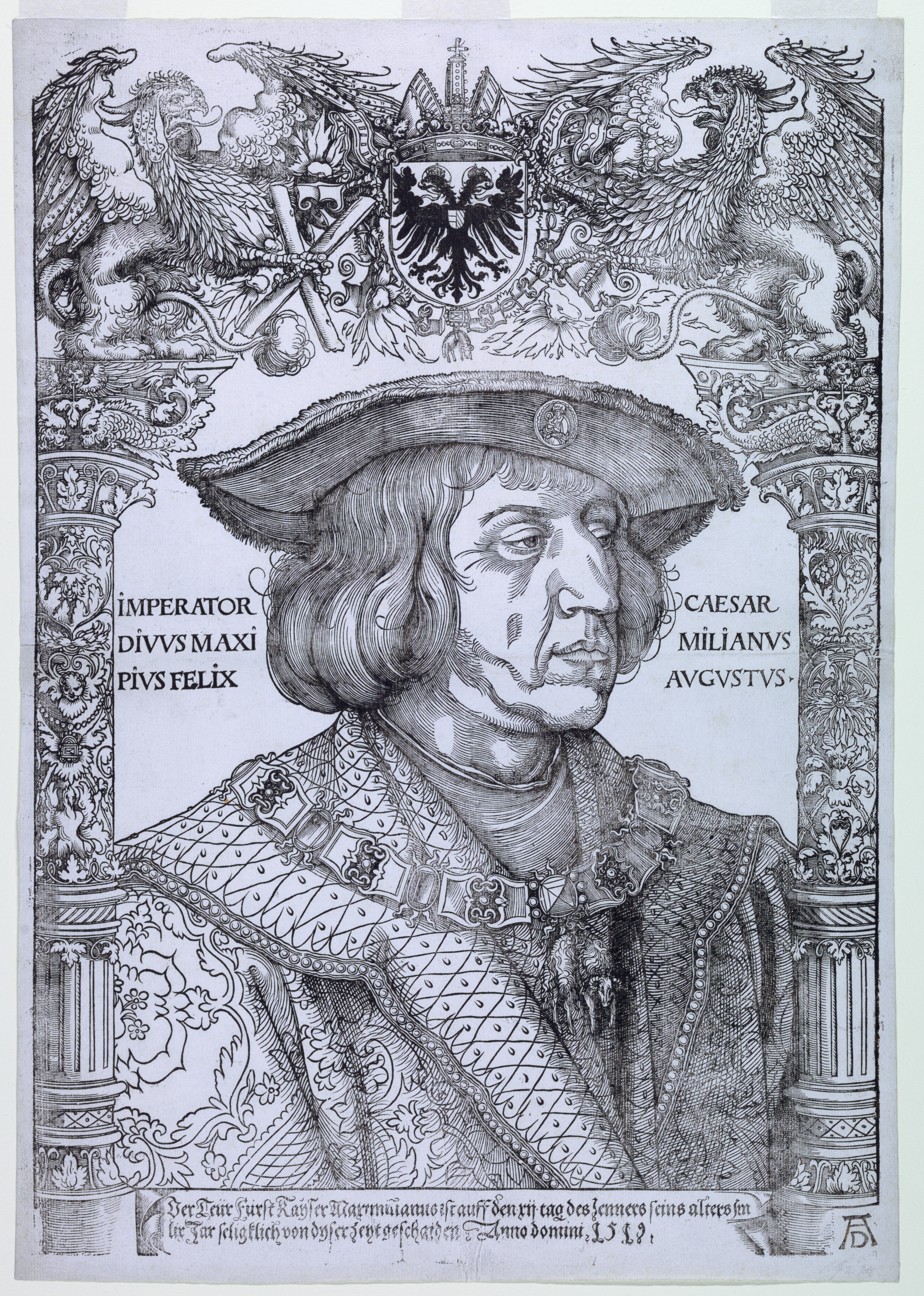 Print, Portrait of Maximilian I; Designed by Albrecht Dürer (German, 1471–1528); Germany; woodcut on off-white laid paper; 1950-30-19