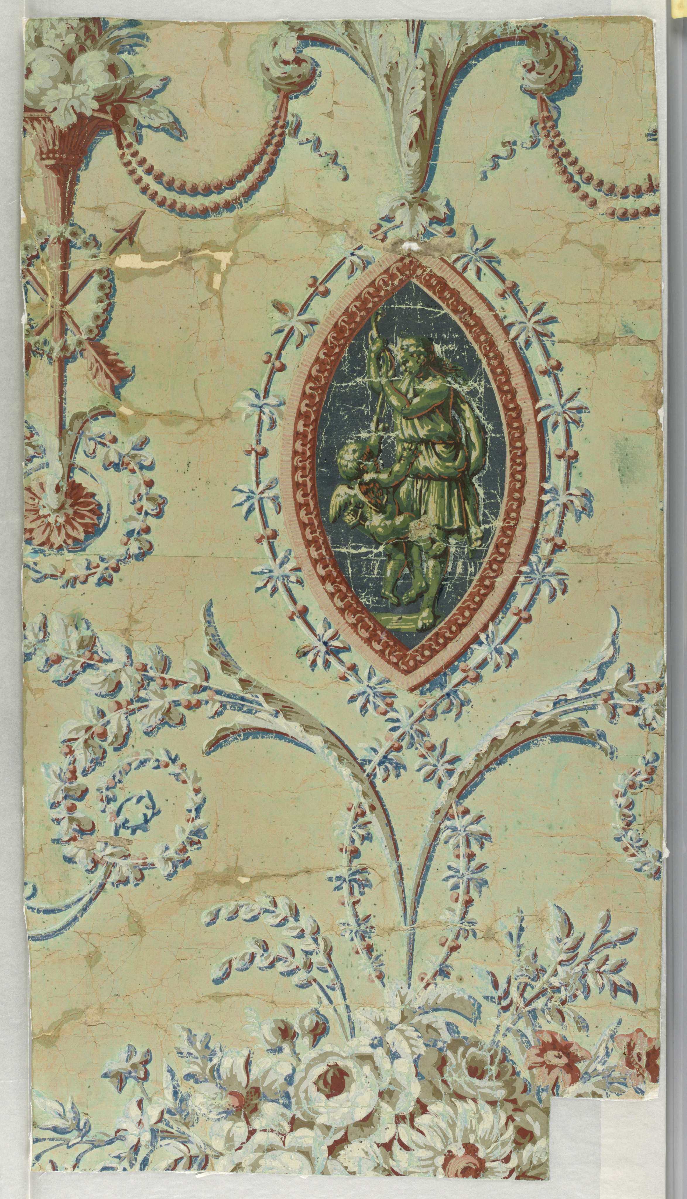 This is a Sidewall - fragment. It is dated 1785–95 and we acquired it in 1950. Its medium is block-printed on handmade paper, joined. It is a part of the Wallcoverings department.