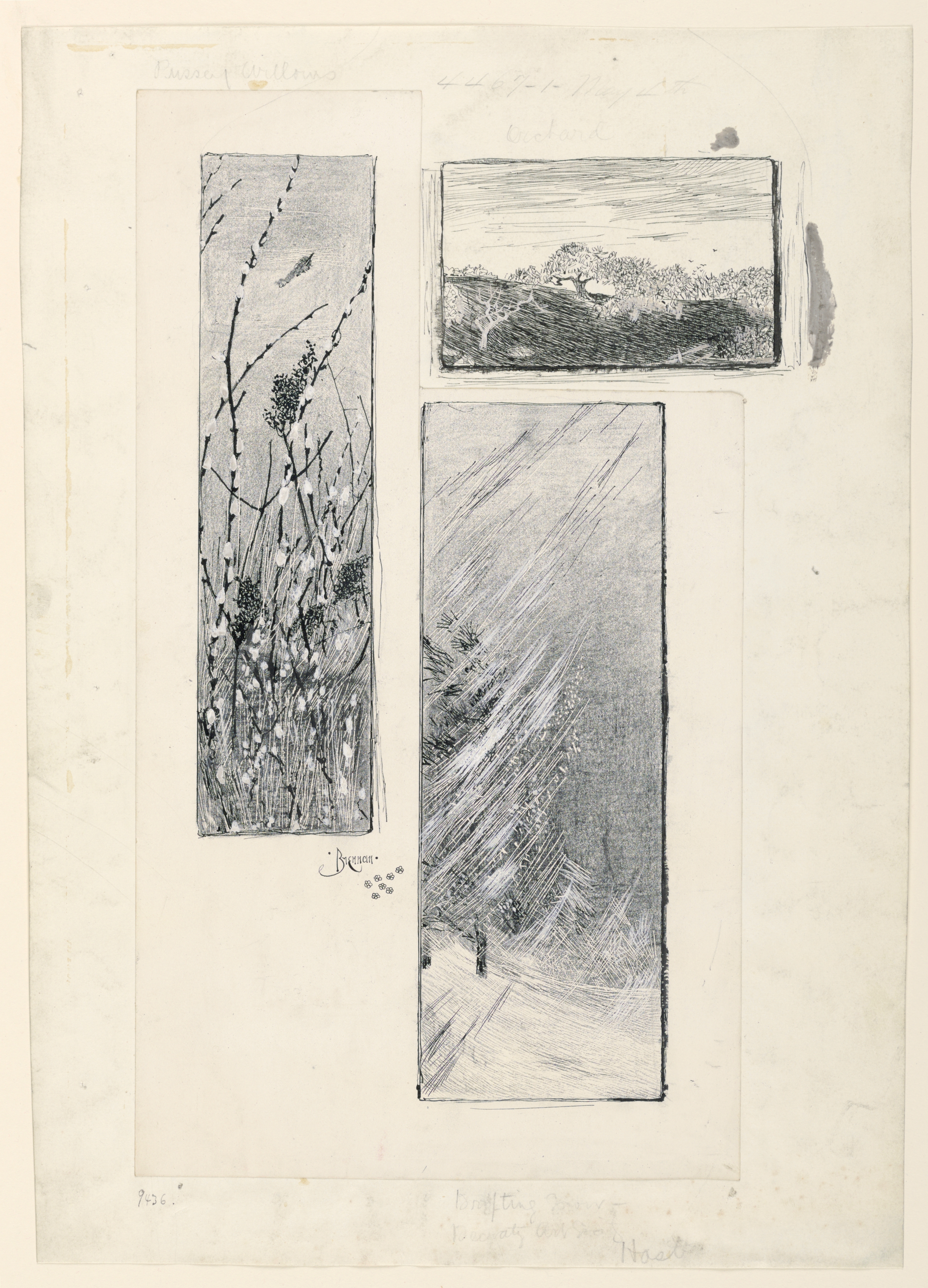 Inscribed in graphite, above left vertical panel: "Pussy Willows"; above horitzontal panel: "Orchard"; below right vertical panel: "Drifting Snow"; upper right corner, "4467-1-May 4th" (?); lower left corner: "9436."; lower right corner: indistinct inscription in graphite.