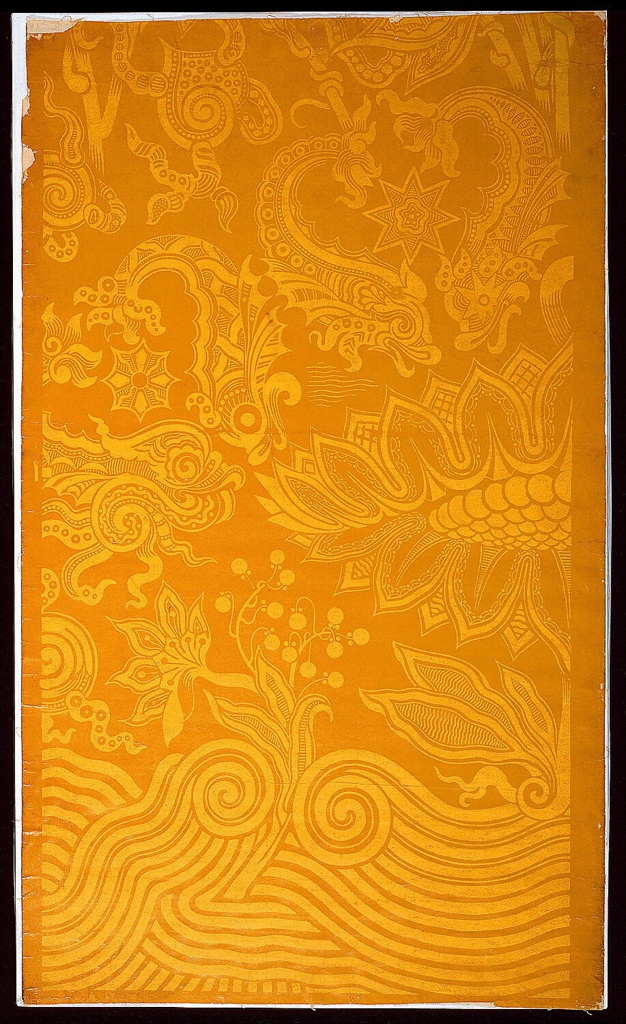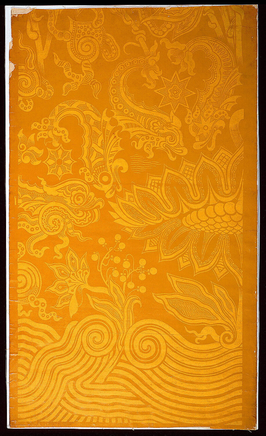 This is the lower portion of one panel of the Dragon wallpaper from the Royal Pavilion at Brighton, England, produced in 1820. The Royal Pavilion was a Chinese-inspired palace built for the Prince of Wales, later to become King George IV. This design was originally hand-painted directly onto the walls in the Drawing Room. The design appealed to the King and within a year of its being painted, he commissioned a company to carve wood blocks of the design so it could be reproduced as wallpaper, which was then hung in multiple rooms. This was a major undertaking as the repeat measured 3 x 2.5 m (10 x 8.5’). It required a 6 panel width and 30 large blocks to print.