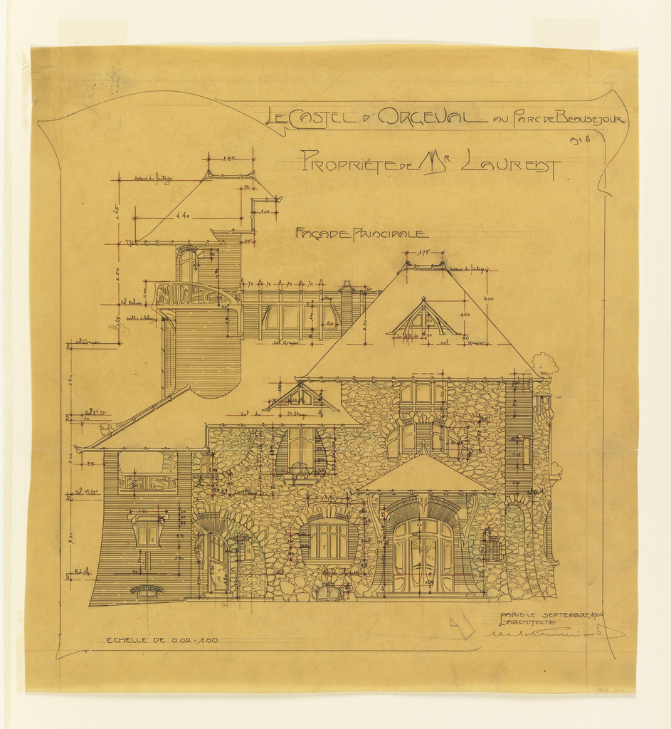 In black ink, upper margin: LE CASTEL D'ORGEVAL AU PARC DE BEAUSEJOUR / NO. 6/ PROPRI T DE MR LAURENT / FA ADE PRINCIPAL; lower right: Paris Le Septembre 1904 / L'ARCHITECTE / Hector Guimard; building notations throughout