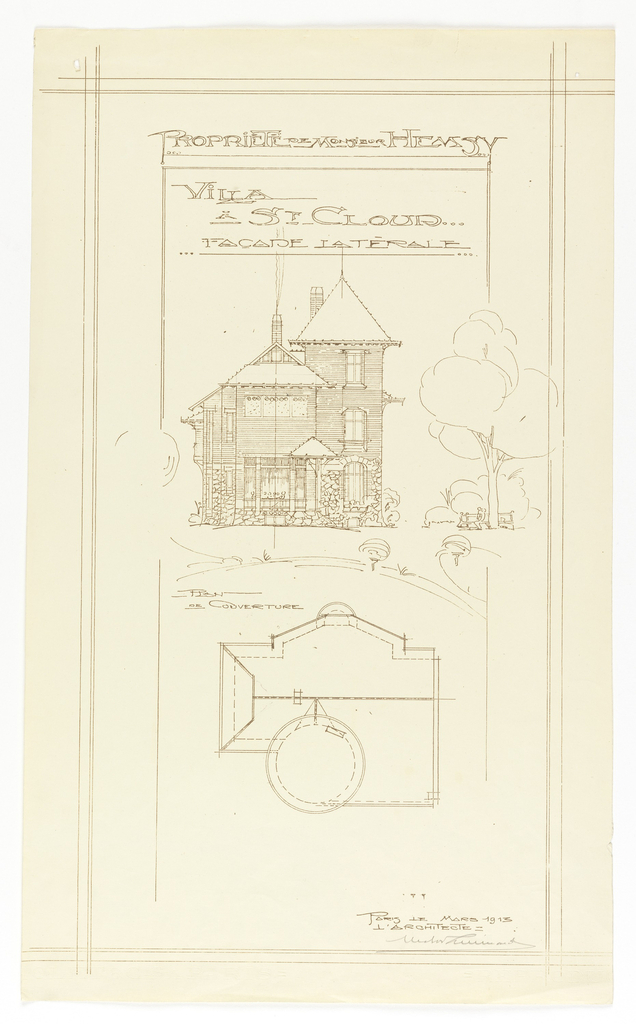 Top center: PROPRIETE DE MONSIEUR HEMSY/ VILLA A ST. CLOUD/ FACADE LATERALE Middle left, above bottom design: PLAN DU COUVERTURE