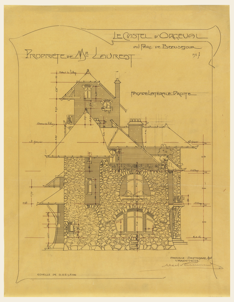 In black ink, above: LE CASTEL D'ORGEVAL / AU PARC DE BEAUSEJOUR /NO. 7 / PROPRIETE DE MR. LAURENT / FACADE LATERALE DROITE; lower right: PARIS SEPTEMBRE 1904 / L'ARCHITECTE / Hector Guimard; building notations throughout.