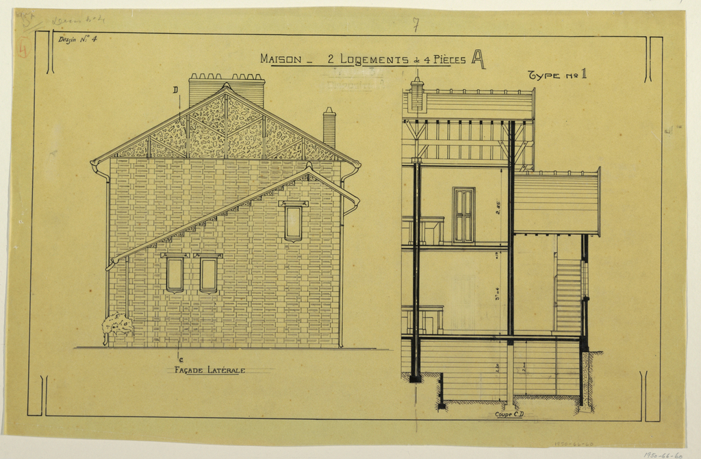 Inscribed in black ink on top: MAISON-- 2 LOGEMENTS DE 4 PIECES A/ TYPE NO. 1 Inscribed below in black ink: FACADE LATERALE