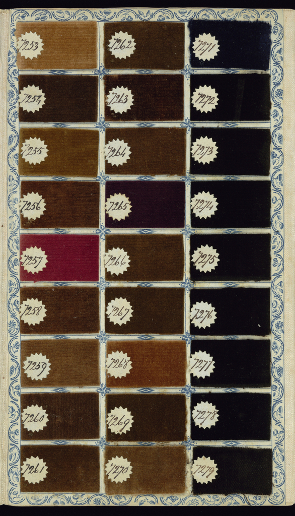 This is a Salesman's sample book. It is dated 1784 and we acquired it in 1950. Its medium is marbleized paper, cardboard, cotton, linen and its technique is plain weave, twill weaves, float weaves (damask), supplementary weft pile (velveteen); 108 examples are block-printed. It is a part of the Textiles department.