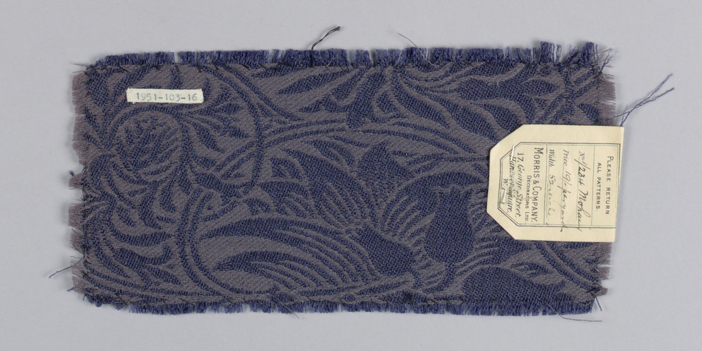 This is a Fragment. It was designed by William Morris. It is dated early 20th century and we acquired it in 1951. Its medium is wool, mohair and its technique is twill weave. It is a part of the Textiles department.