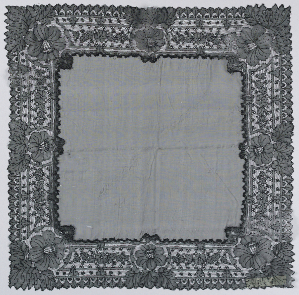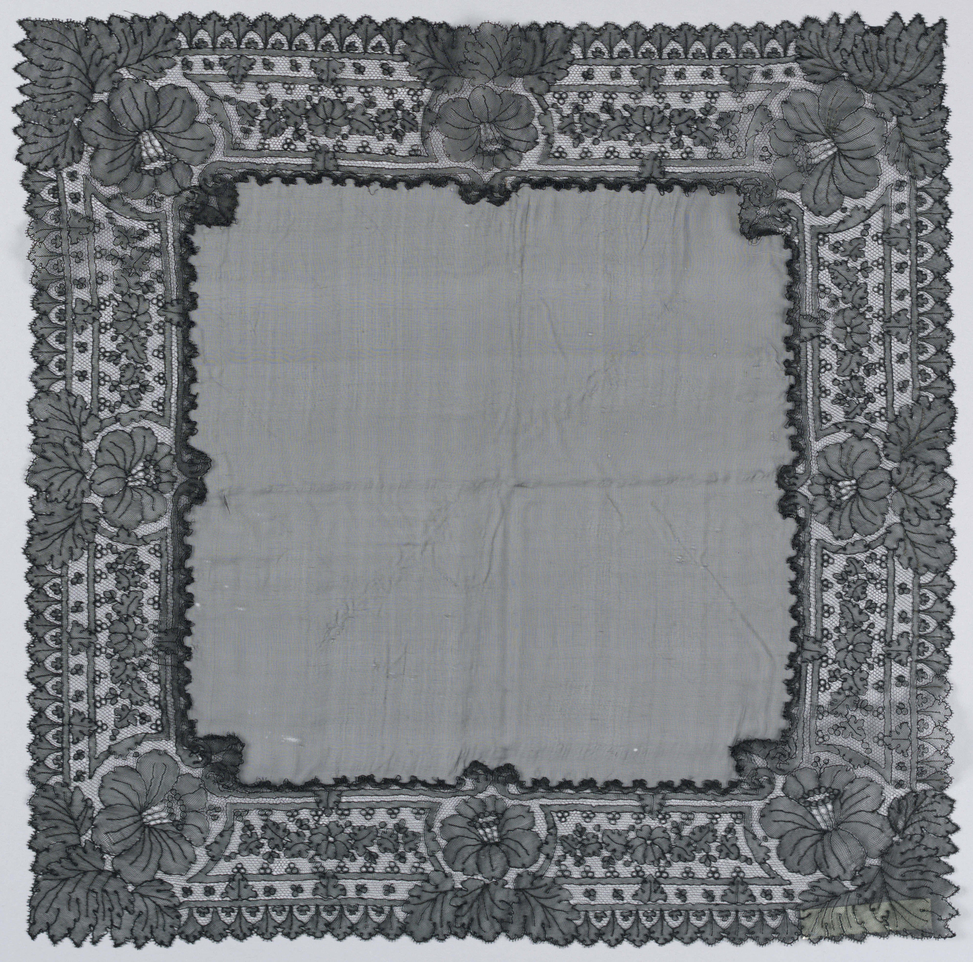 This is a Mourning handkerchief. It is dated 19th century and we acquired it in 1951. Its medium is silk and its technique is bobbin lace, chantilly style. It is a part of the Textiles department.