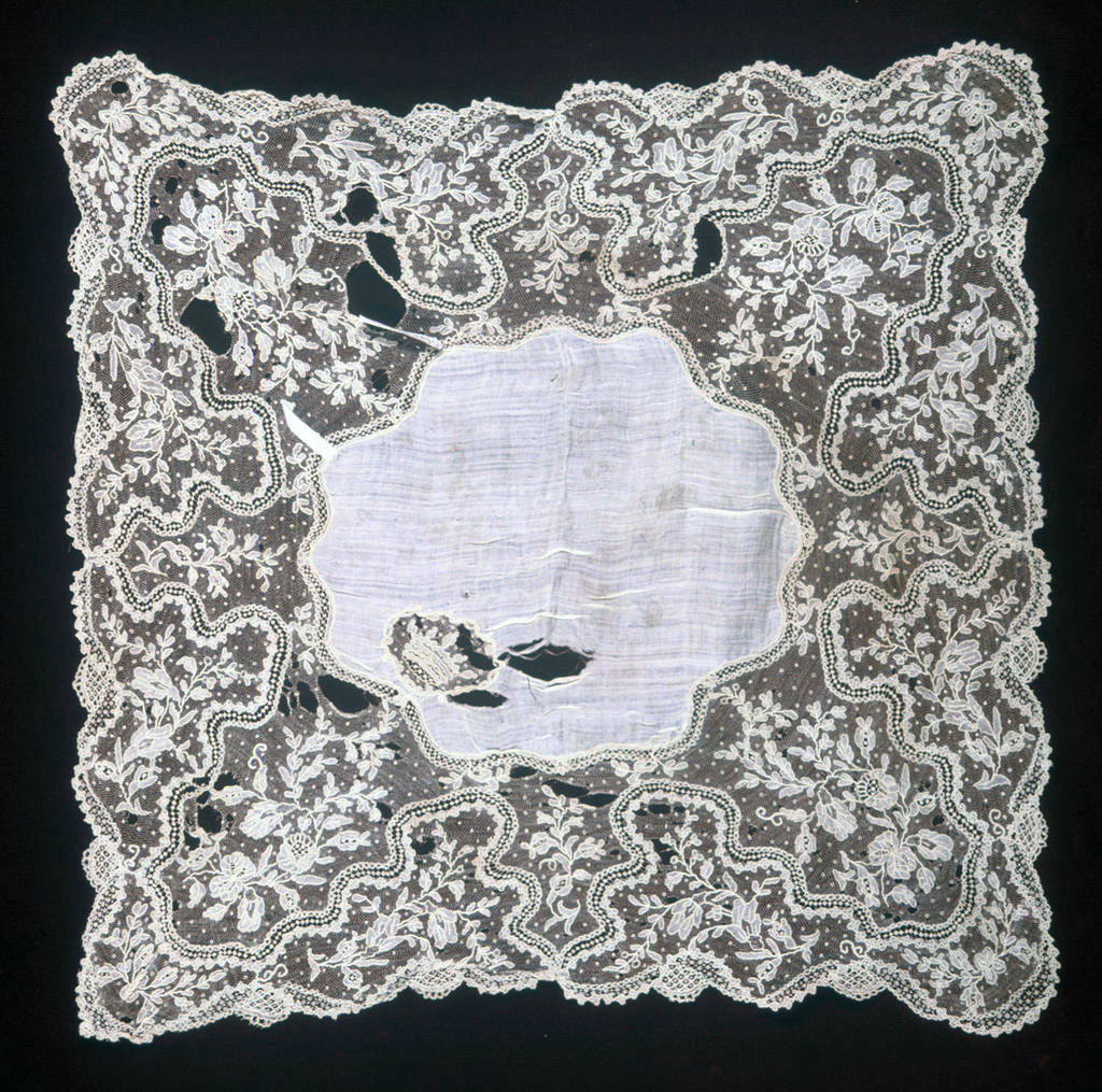This is a Handkerchief. We acquired it in 1951. Its technique is needle lace. It is a part of the Textiles department.