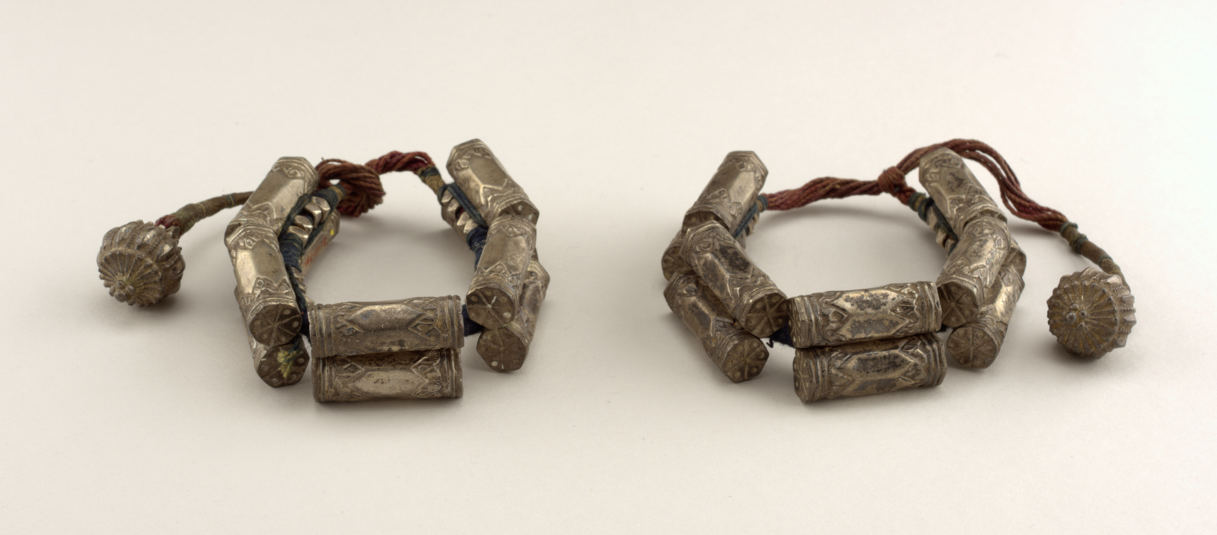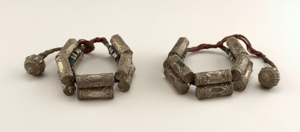 This is a Pair of anklets. It is dated probably 19th century and we acquired it in 1951. Its medium is silver. It is a part of the Product Design and Decorative Arts department.