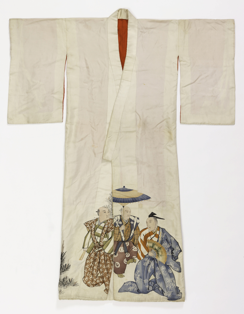 This is a Kimono. It is dated late 19th–early 20th century and we acquired it in 1951. Its medium is silk and its technique is painted on satin weave. It is a part of the Textiles department.