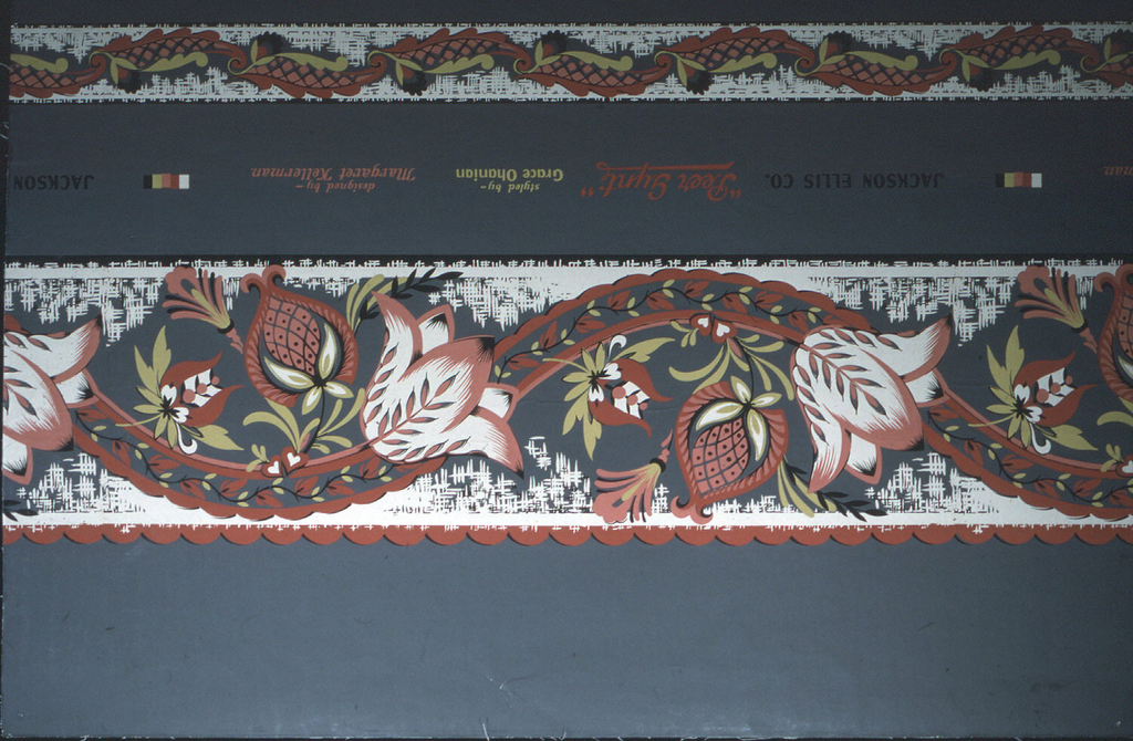 This is a Borders. It was designed by Grace Ohanian. It is dated 1950–51 and we acquired it in 1951. Its medium is screen printed on paper. It is a part of the Wallcoverings department.