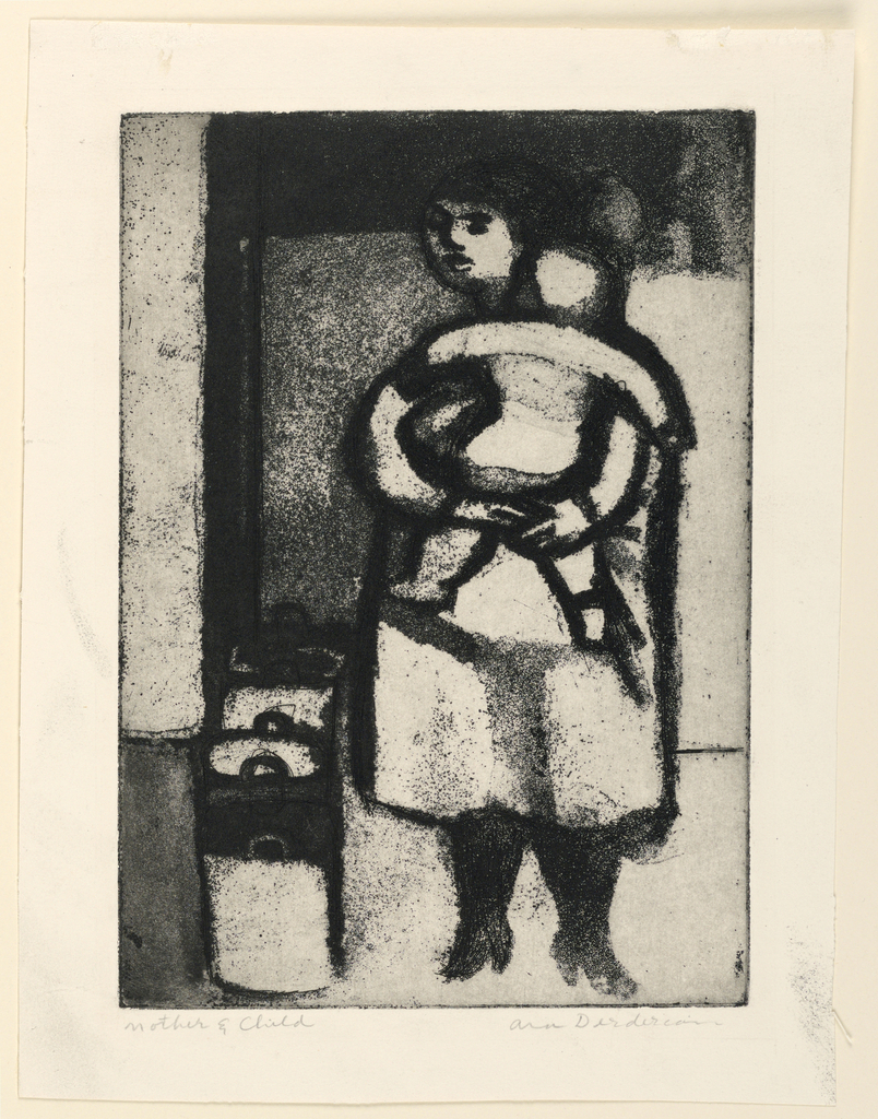 Print, Mother and Child; Ara Derderian; USA; black ink on white paper; H x W (Plate line): 25 × 17.6 cm (9 13/16 × 6 15/16 in.) H x W (Paper): 29.9 × 22.8 cm (11 3/4 in. × 9 in.); 1951-141-5