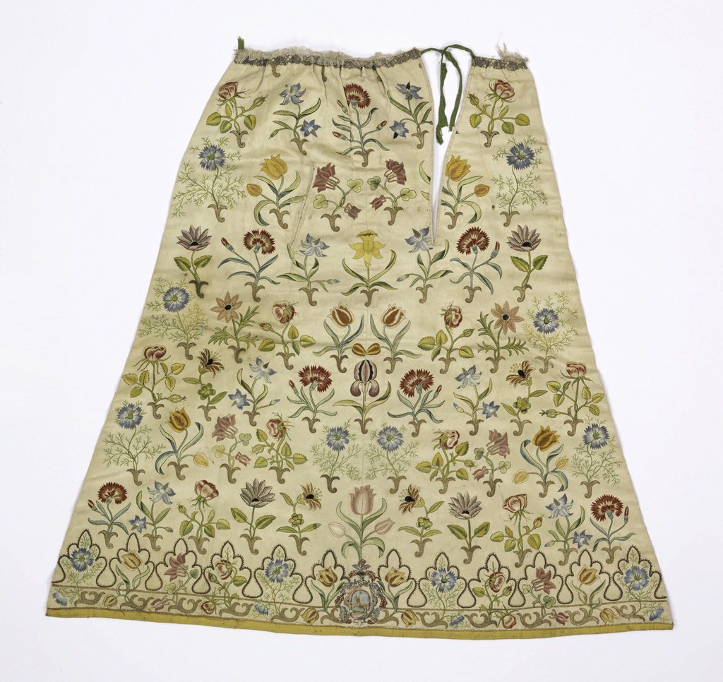 This is a Skirt front. It is dated 18th century and we acquired it in 1951. Its medium is silk embroidery on silk foundation, lined with linen and its technique is embroidered in satin and stem stitches on satin weave. It is a part of the Textiles department.
