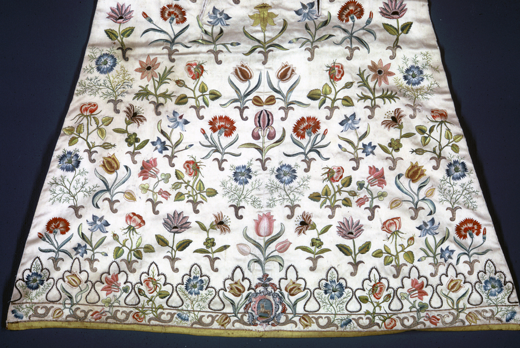 This is a Skirt front. It is dated 18th century and we acquired it in 1951. Its medium is silk embroidery on silk foundation, lined with linen and its technique is embroidered in satin and stem stitches on satin weave. It is a part of the Textiles department.