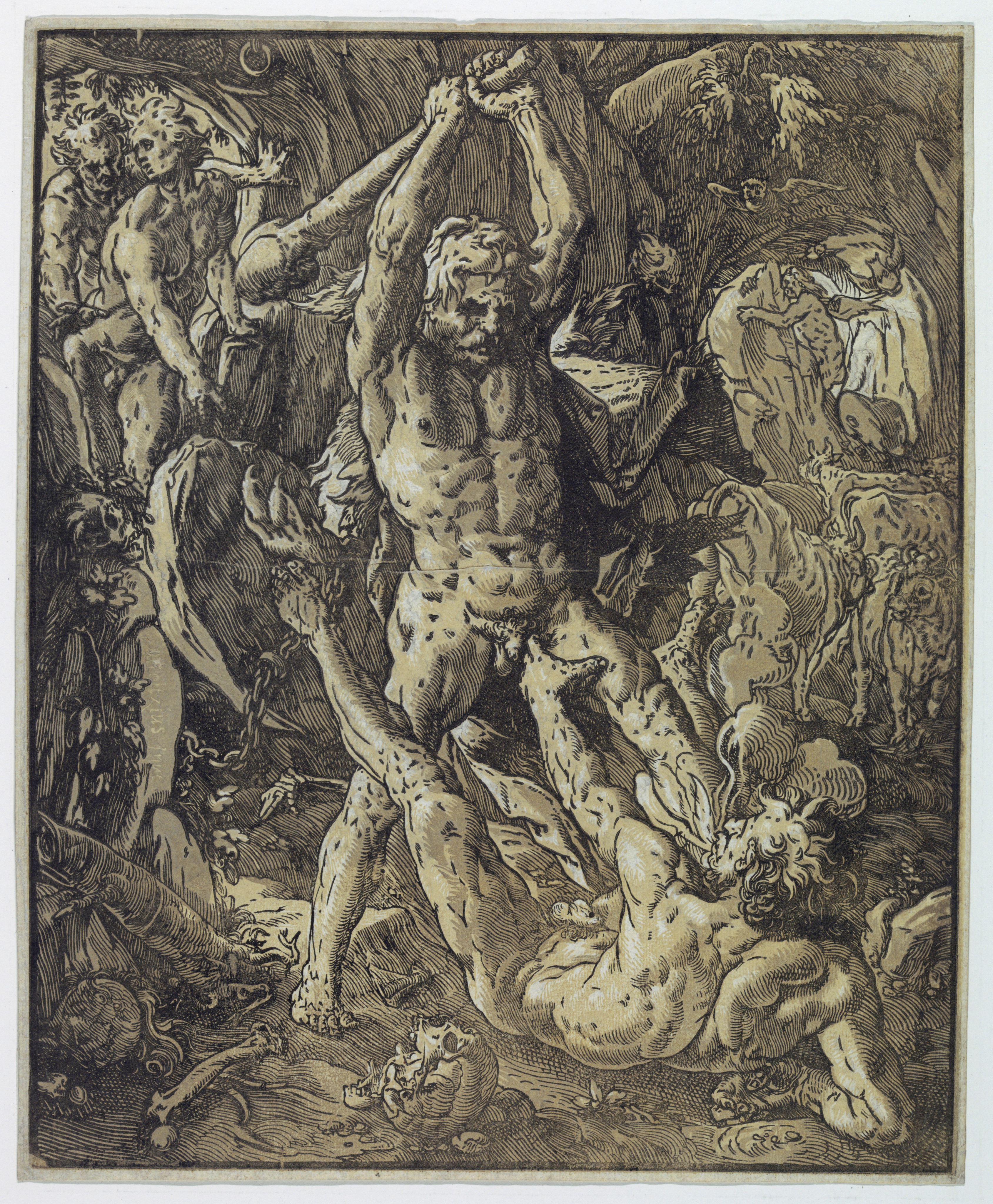 Print, Hercules Killing Cacus; Print Maker: Hendrik Goltzius (Netherlandish, 1558 – 1617); chiaroscuro woodcut from three blocks in black, yellow, and olive-green, on laid paper; H x W: 41.9 × 33.7 cm (16 1/2 × 13 1/4 in.); Museum purchase through gift of Eleanor G. Hewitt; 1951-43-1