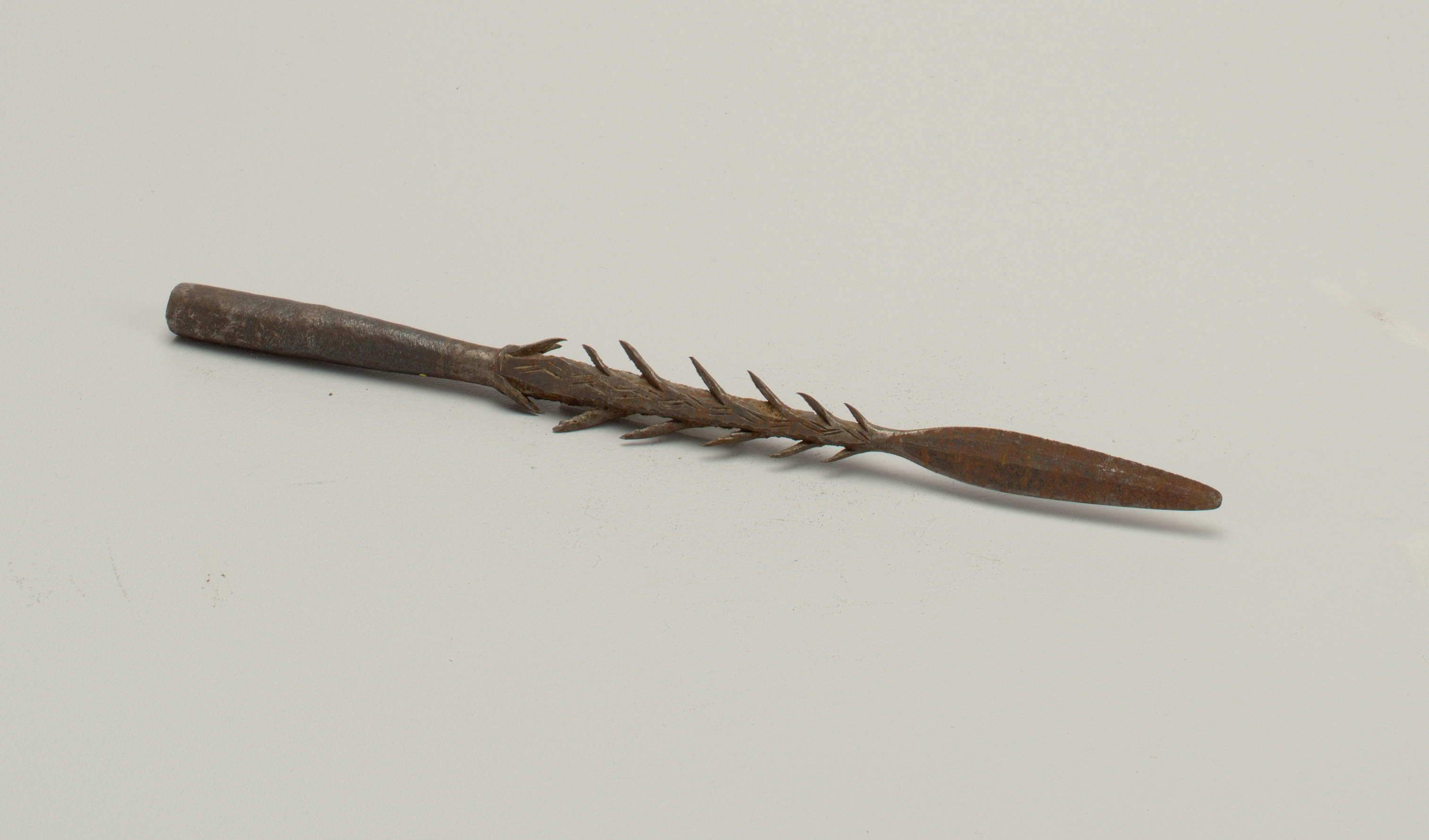This is a spearhead. It is dated 19th century and we acquired it in 1951. Its medium is steel. It is a part of the Product Design and Decorative Arts department.