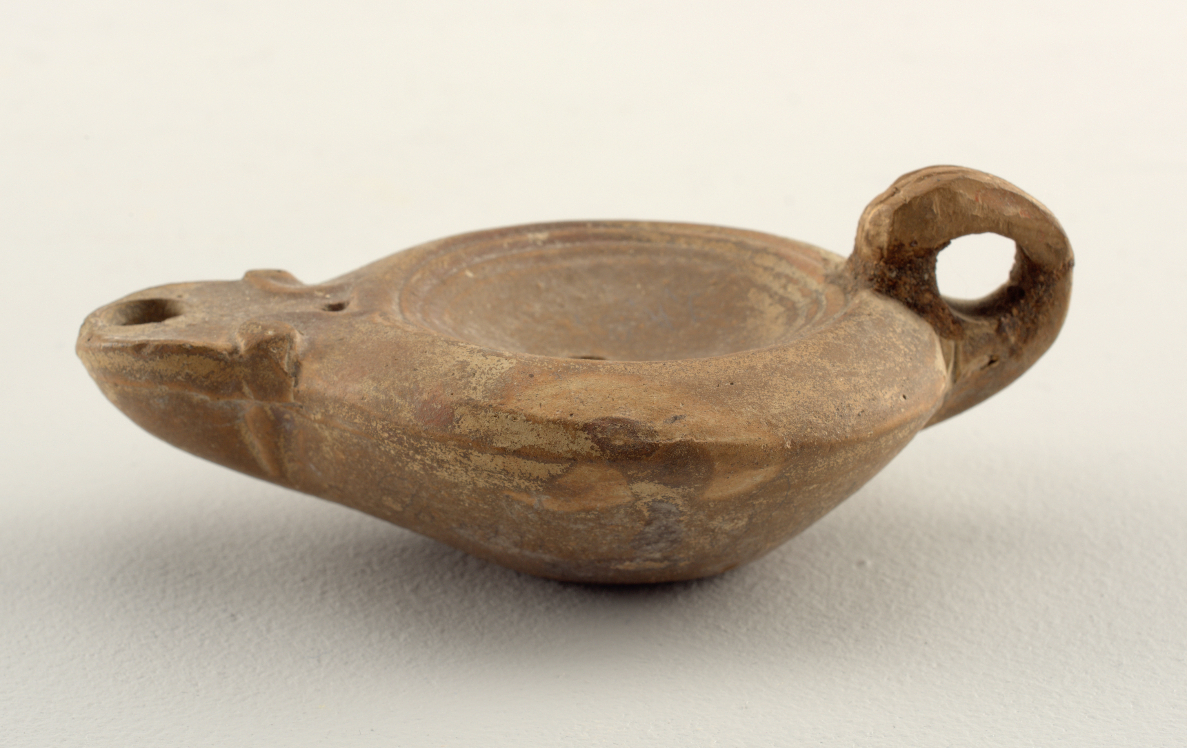 This is a oil lamp. It is dated 1st century BC and we acquired it in 1951. Its medium is earthenware. It is a part of the Product Design and Decorative Arts department.