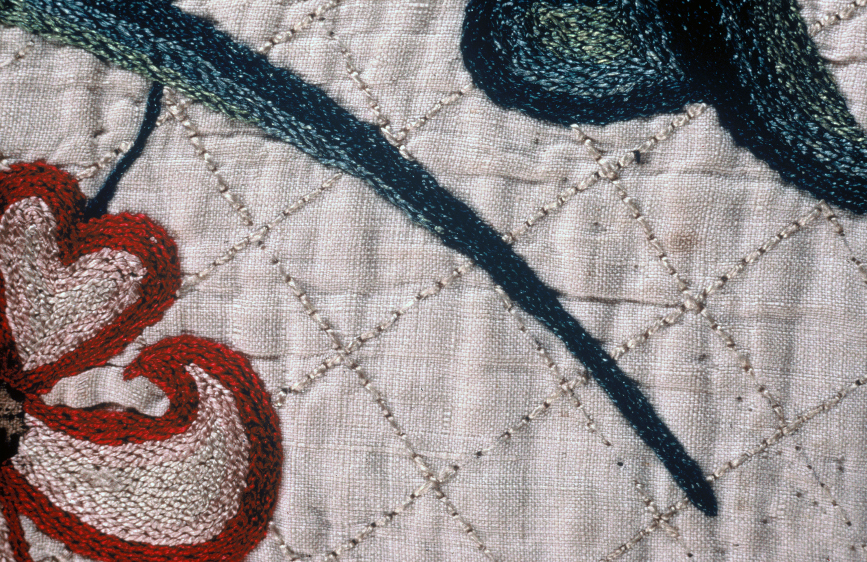 This is a Fragments. It is dated 18th century and we acquired it in 1952. Its medium is silk on linen and its technique is chain, satin, knot and back embroidery stitches on plain weave; background embroidered in intersecting diagonal lines. It is a part of the Textiles department.