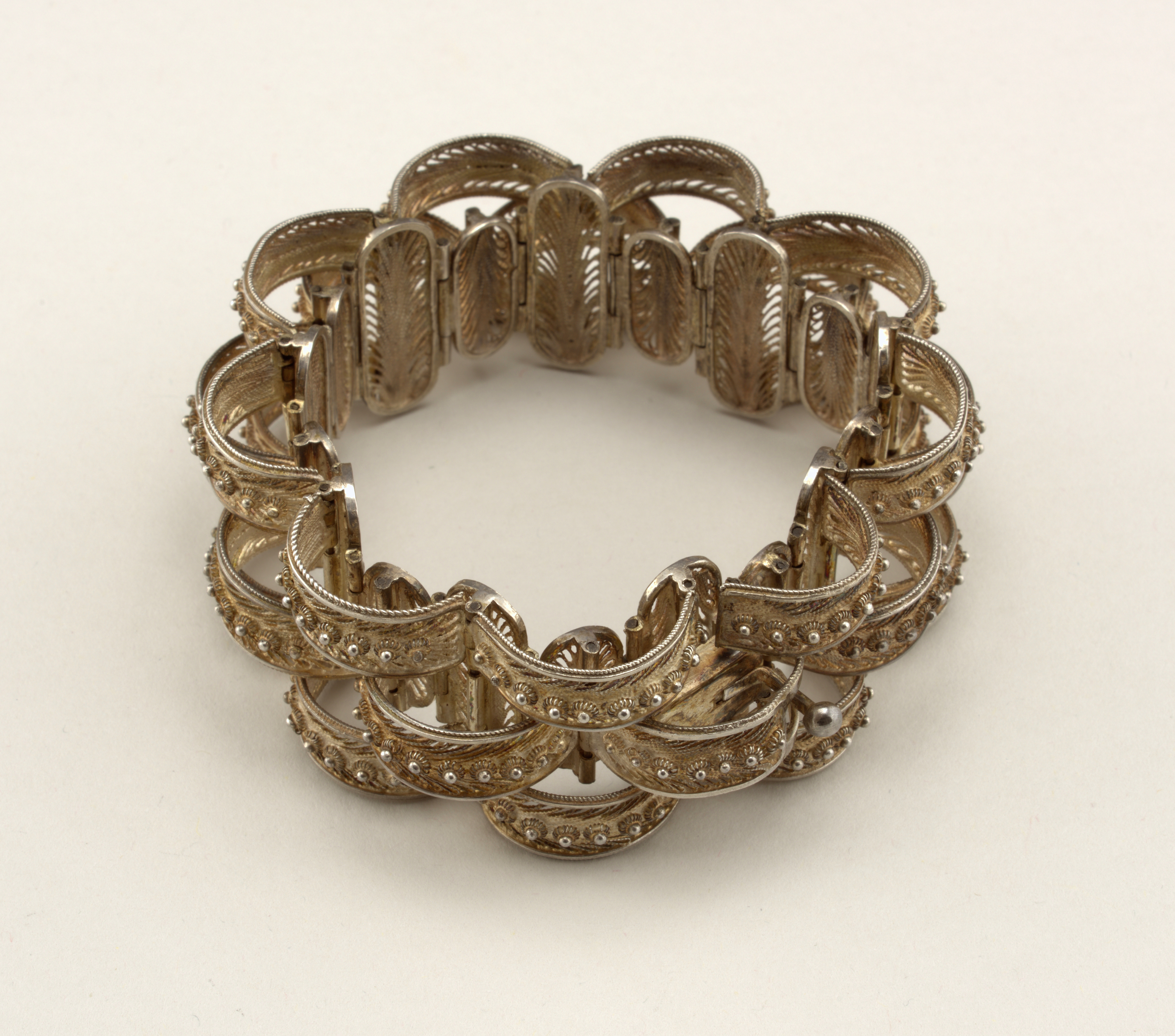 This is a Bracelet, comb and earrings. It is dated ca. 1875 and we acquired it in 1952. Its medium is filigree, silver. It is a part of the Product Design and Decorative Arts department.