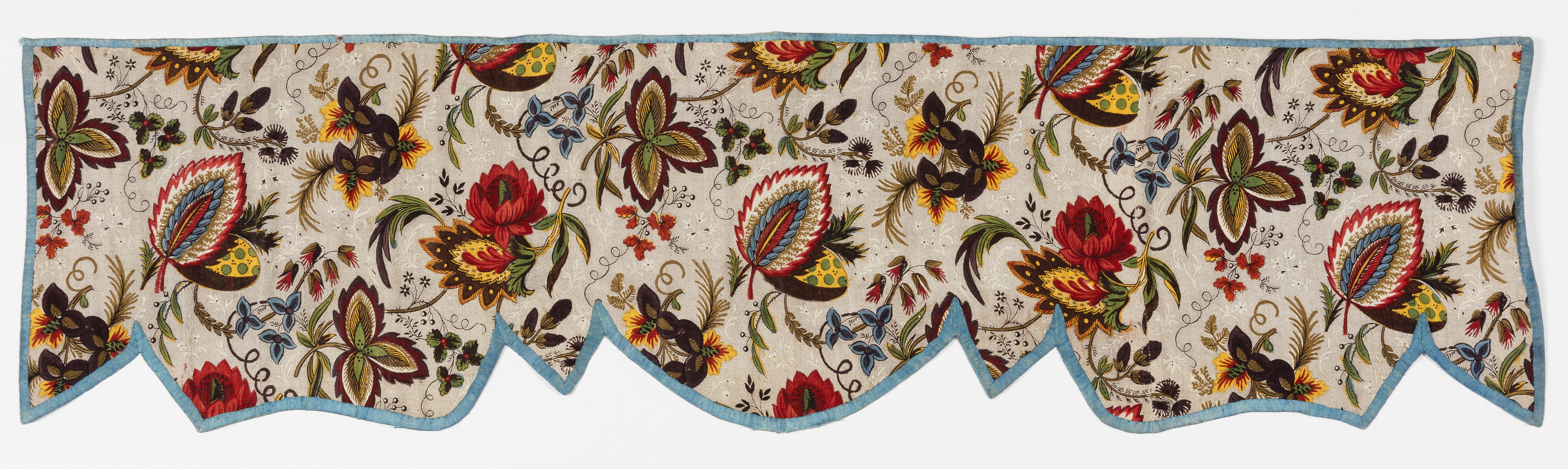 This is a Valance. It is dated late 18th–early 19th century and we acquired it in 1952. Its medium is cotton, linen, silk and its technique is block-printed on plain weave, lined with plain weave linen and bound with blue silk tape. It is a part of the Textiles department.
