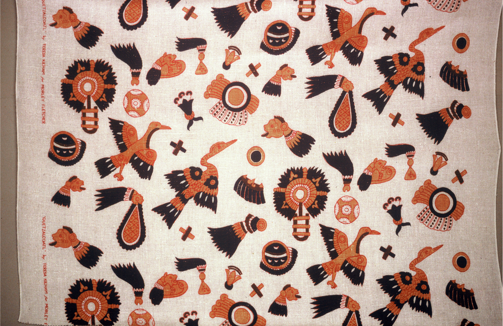 This is a Textile. It was designed by Teresa Kilham. We acquired it in 1952. Its medium is unbleached linen and its technique is silk screen. It is a part of the Textiles department.