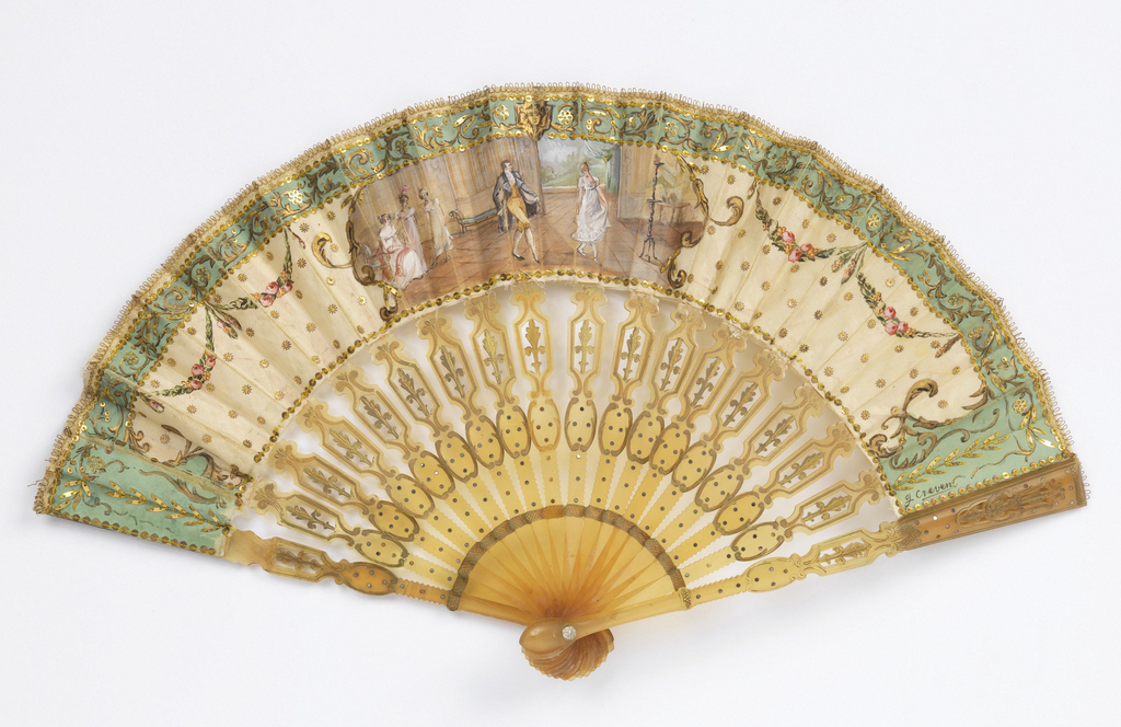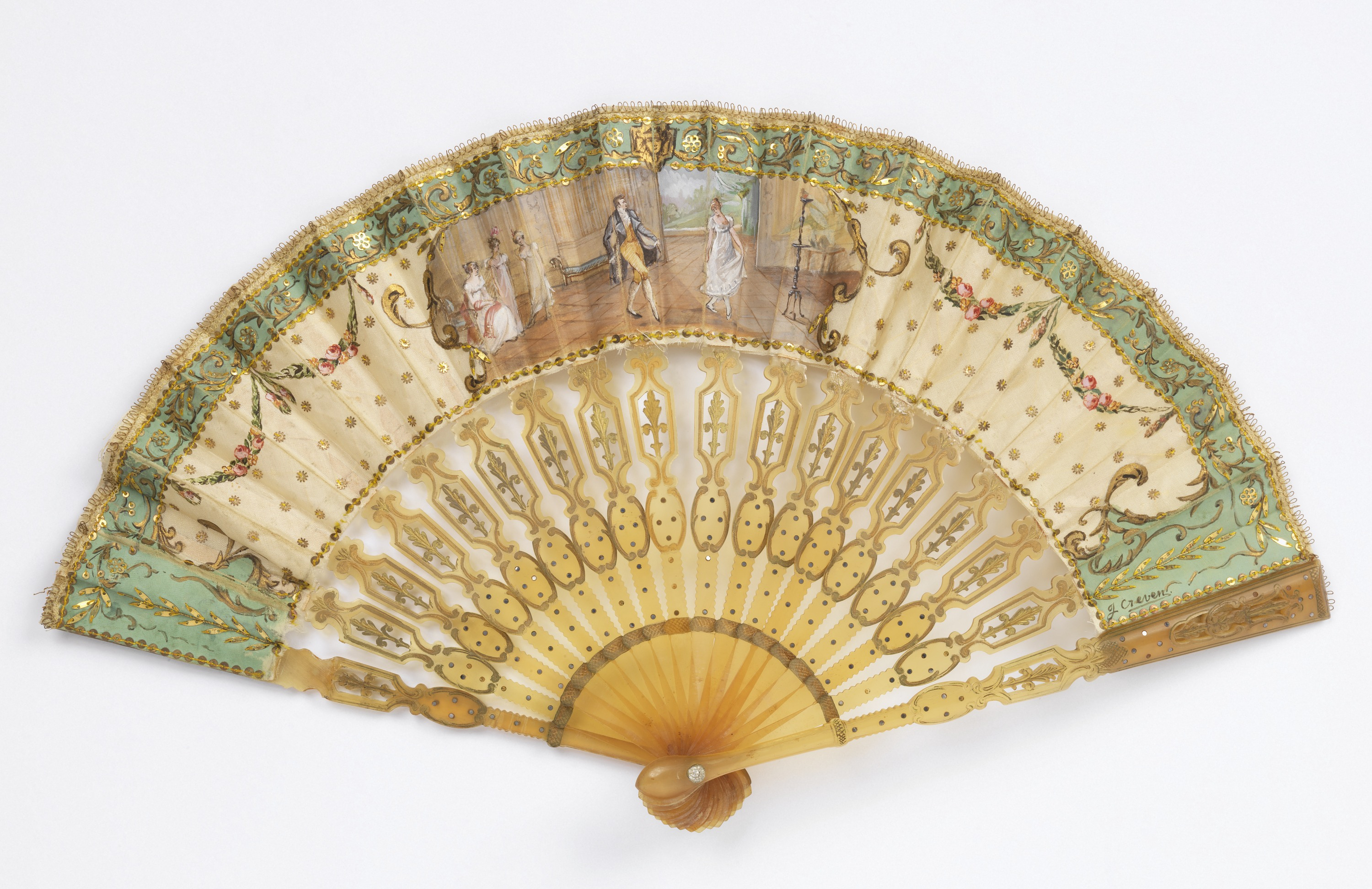 This is a Pleated fan and case. It was painted by J. Creven and manufactured by Ernest Kees Fabrique d'Eventail. It is dated late 19th–early 20th century and we acquired it in 1952. Its medium is painted and embroidered silk leaf, pierced, engraved and gilded horn sticks. It is a part of the Textiles department.