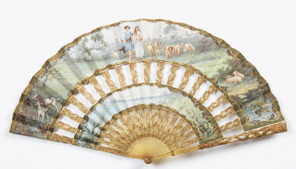 This is a Cabriolet fan and case. It was distributed by Tiffany and Co.. It is dated ca. 1900 and we acquired it in 1952. Its medium is gouache-painted parchment backed with painted silk, incised and painted horn sticks, rivet set with a glass stone. It is a part of the Textiles department.