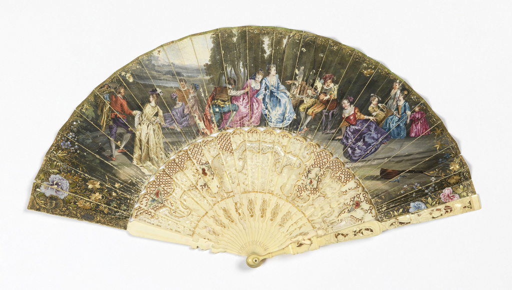 This is a Pleated fan. It was after Antoine Watteau. It is dated ca. 1740 and we acquired it in 1952. Its medium is parchment leaf painted in watercolor, carved and pierced mother-of-pearl sticks with gold foil and applied straw decoration . It is a part of the Textiles department.