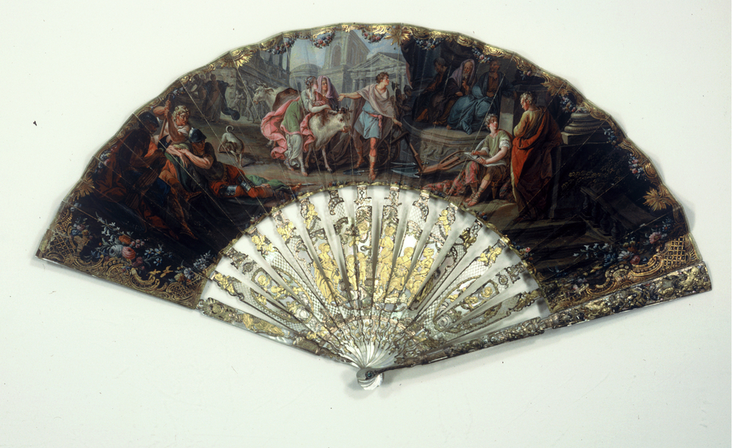 This is a Pleated fan. It is dated 18th century and we acquired it in 1952. Its medium is parchment leaf painted in gouache, carved and pierced mother-of-pearl sticks overlaid with gold and silver foil, rivet set with a faceted stone. It is a part of the Textiles department.