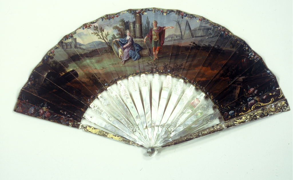 This is a Pleated fan. It is dated 18th century and we acquired it in 1952. Its medium is parchment leaf painted in gouache, carved and pierced mother-of-pearl sticks overlaid with gold and silver foil, rivet set with a faceted stone. It is a part of the Textiles department.