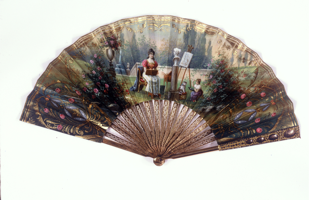 This is a Pleated fan and case. It is dated early 20th century and we acquired it in 1952. Its medium is painted and gilded paper leaf, gilt bronze guards and sticks with enamel plaques and cut steel, paste gem at rivet head. It is a part of the Textiles department.
