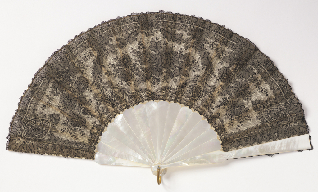 Pleated Fan And Case; Distributed by Tiffany and Co. (United States); silk bobbin lace leaf backed with silk, mother-of-pearl sticks, paste jewel at rivet; H x W (open): 31.8 × 56.2 cm (12 1/2 × 22 1/8 in.); Gift of Anonymous Donor; 1952-161-233-a,b
